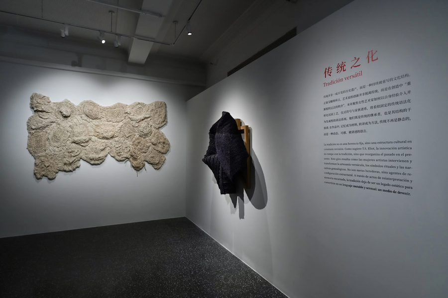 林芳璐《她的山丘》与索尼娅·纳瓦罗《STIRPA I》,一白一黑,密密织就,在手工艺的探索上得以充分交流。林芳璐到云南学习白族的扎染工艺,为自己的艺术创作找到独特的灵感。纳瓦罗则将摩洛哥的茅草编织用于自己的艺术创作。她们不约而同都以艺术的方式留存、活化着古老的手工艺。